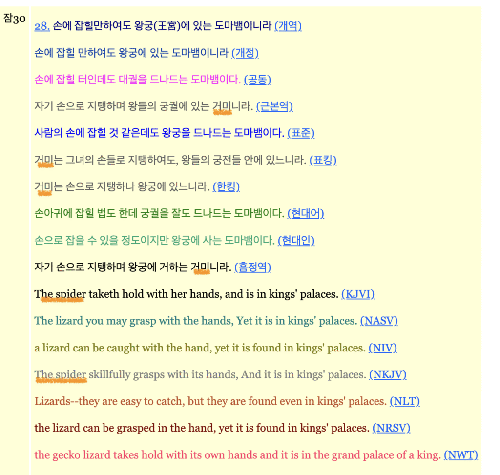 여기에서 ‘거미’라는 단어가 씌여있다. 하지만 우리나라에서 현재 보고 있는 개역성경은 어떻게 되어 있는가?